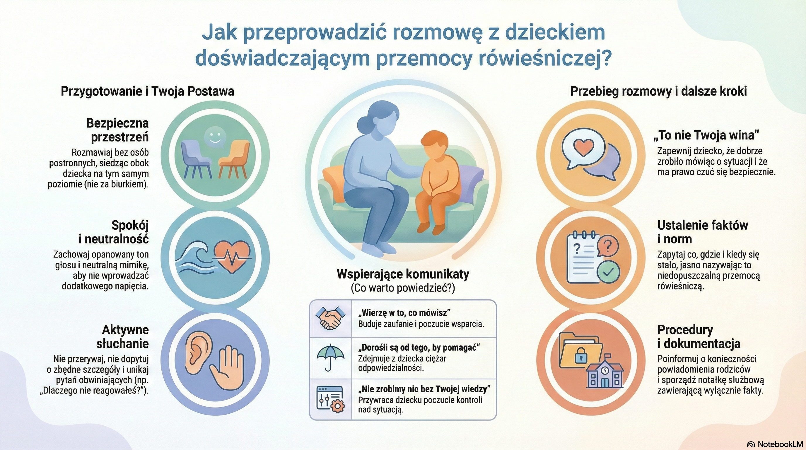 Ten dokument stanowi kompleksowy instruktaż dla dorosłych, który wyjaśnia, jak przeprowadzić bezpieczną rozmowę z dzieckiem doświadczającym przemocy rówieśniczej. Materiał kładzie szczególny nacisk na stworzenie atmosfery zaufania oraz zapewnienie młodemu człowiekowi ochrony emocjonalnej i fizycznej. Wytyczne obejmują konkretne techniki komunikacyjne, takie jak aktywne słuchanie i unikanie oceniania, a także przykładowe zwroty budujące poczucie bezpieczeństwa. Materiał przypomina również o proceduralnych obowiązkach personelu wynikających ze Standardów Ochrony Małoletnich, w tym o konieczności dokumentowania faktów i informowania opiekunów. Głównym celem przedstawionego scenariusza jest skuteczne przerwanie przemocy oraz przywrócenie dziecku wiary we wsparcie ze strony dorosłych. Wszystkie te działania mają na celu profesjonalne i empatyczne rozwiązanie sytuacji kryzysowej w środowisku szkolnym lub innym środowisku, w którym przebywa dziecko.